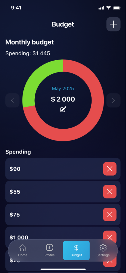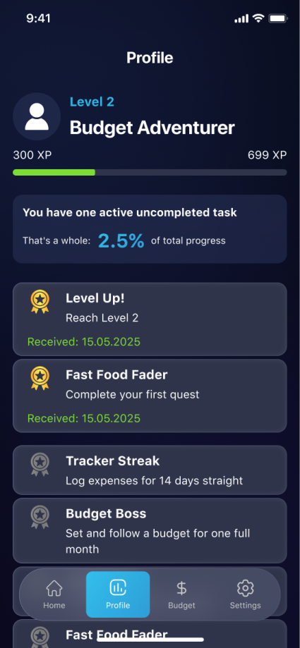 Complete financial challenges across four categories, earn XP to level up your profile, and track your spending with monthly limits and achievements — making money management both fun and rewarding.