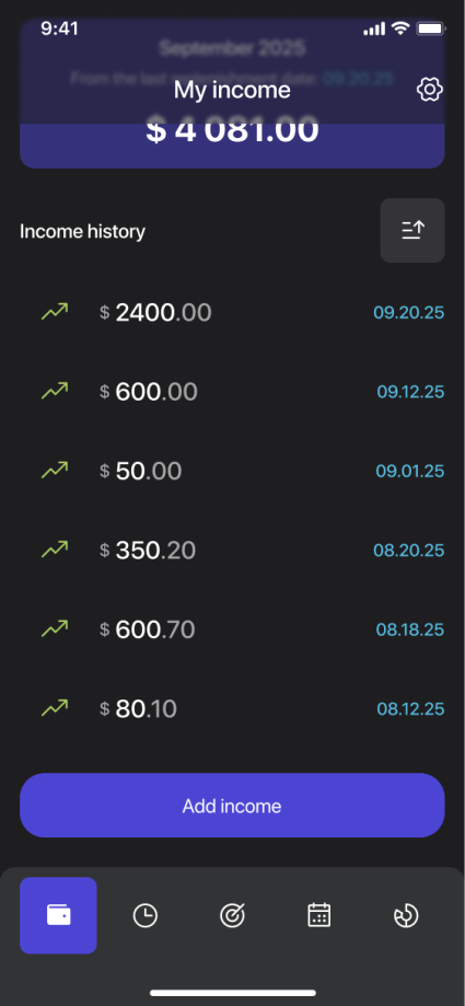 Add income entries with amount and date
