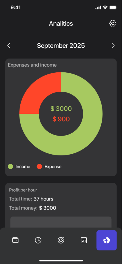 Log earnings, manage expenses, set financial goals, track tasks, and analyze how your work time relates to actual profit.